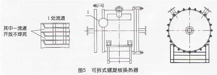 卷制后的螺旋板式換熱器,每端只將一個流道焊死,而 另一個流道開放,然后在端面上加端蓋加以密封。其端蓋可以拆卸,從而清理流道內(nèi)部。它適用于易堵塞的流體換熱。