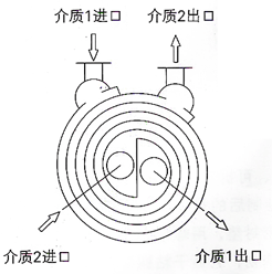 對于進行換熱的兩種介質(zhì),如果都是液體,在螺旋板式換熱器的六道中是按螺旋方向流動的,如圖二,并且按逆流的方式流動,所謂逆流是指相鄰流道中兩種液體流動的方向相反,這樣能使兩流體在相互傳熱的流程中始終保持一定的溫差,從而可獲得較好的效果。