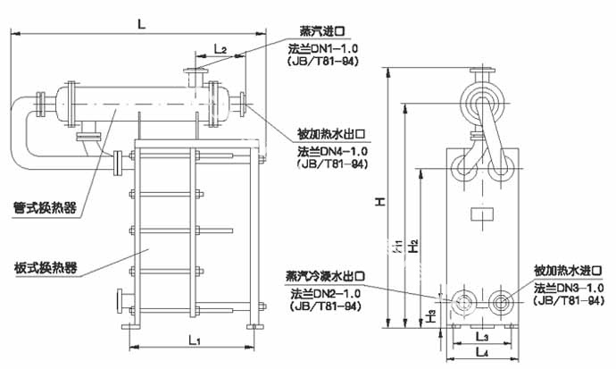為了克服傳統(tǒng)板式換熱器使用溫度低的缺點,當(dāng)熱側(cè)介質(zhì)為溫度超過密封墊片設(shè)計溫度的蒸汽時,在板式換熱器基礎(chǔ)上加裝了降溫減壓裝置,叢而保證設(shè)備運行平穩(wěn)可靠。為方便安裝與設(shè)計,樣本中給定了汽一水換熱器外形尺寸,僅供參考。以下是比較典型的型號,最終設(shè)計還需通過本公司技術(shù)部門的確認。