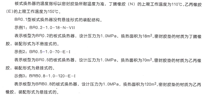 我公司生產的板式換熱器按照 GB16409-1996 《板式換熱器》進行設計、制造和檢驗,代號也按其標準規定來表示。
