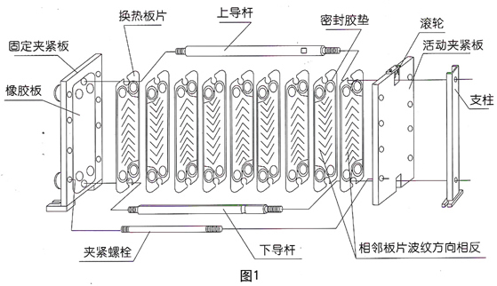 The structural breakdown of the plate heat exchanger is shown in Figure 1, and the product appearance is shown in Figure 2. The main components are heat exchanger plates, sealing rubber pads, clamping plates, guide rods and clamping bolts. The heat exchanger plate is formed by pressing stainless steel plate, which is provided with four flow holes, the middle part of which is pressed into herringbone corrugation, and the periphery of which is pressed with sealing grooves. A sealing rubber pad is stuck in the sealing groove. Heat exchange plates are positioned and aligned by two guide rods, and two clamping plates press each plate by clamping bolts, thus forming a heat exchange channel in the inner cavity of the heat exchanger. The herringbone corrugations of adjacent heat exchange plates are installed in opposite directions, and the contact points support each other. The herringbone corrugation and these supporting points make the fluid medium fully turbulent when flowing in it, which is the main reason why the plate heat exchanger has high heat exchange efficiency. In addition, the thickness of the heat exchange plate is thinner, the thermal conductivity and thermal resistance are smaller, and the fluid medium flow distribution on both sides of the plate is more balanced, which also makes the heat transfer more sufficient.